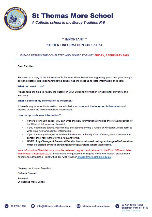 This checklist contains the information St Thomas More School currently has on file for you and your family. It is important that this information is correct and up to date. Please take the time to review the details on the Student Information Checklist, and ensure any corrections are noted on the checklist or accompanying form, that it is signed, and returned to the school by Friday, 7 February.